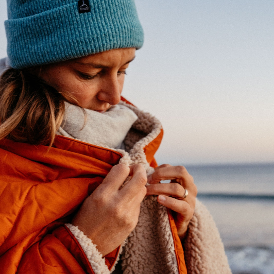UNFOLD dient dir als wärmendes Cape beim Sonnenauf- und -untergang in den Bergen, am Strand oder im Garten am Lagerfeuer. Schwinge die warme Kuscheldecke um dich herum und knöpfe dich kuschelig. Mit den Maßen 145 cm x 205 cm kannst du dich komplett einkuscheln.