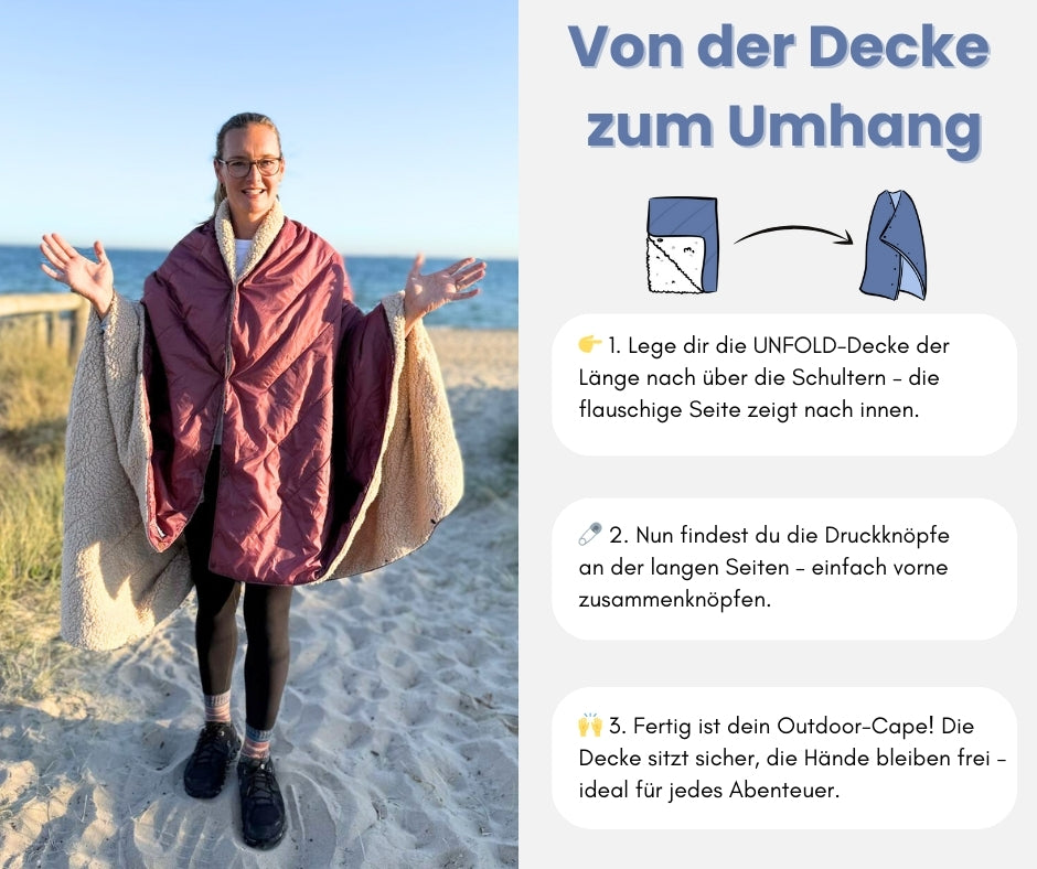 Mit Druckknöpfen zum wärmenden Umhang – perfekt für Strand, Camping & Abenteuer.